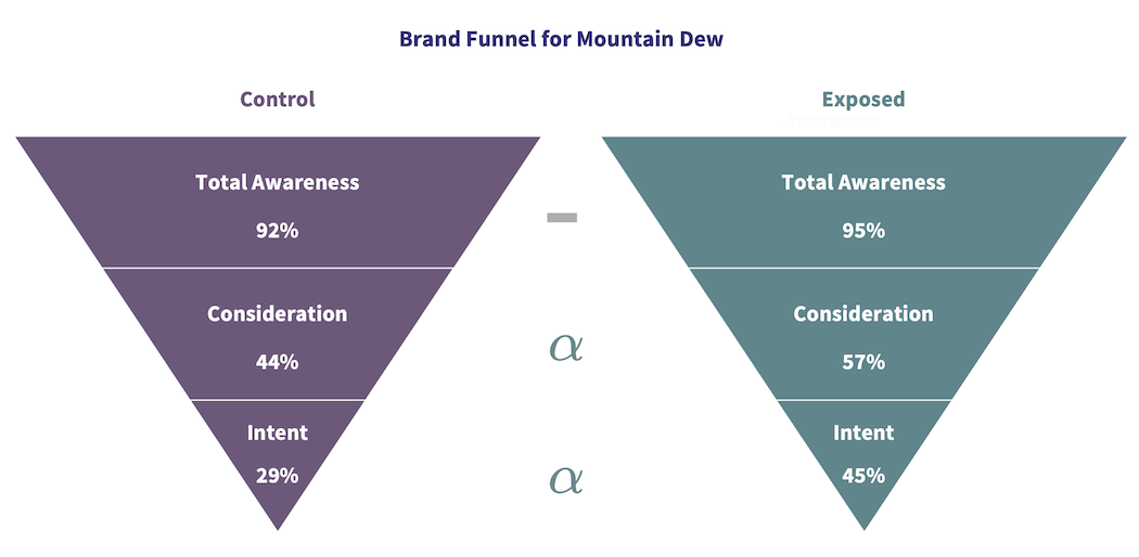 As can be seen in the graphic above, there is a statistically significant increase at both Consideration and Intent levels of the Brand Funnel for Mountain Dew, highlighting that the ad has performed very well.