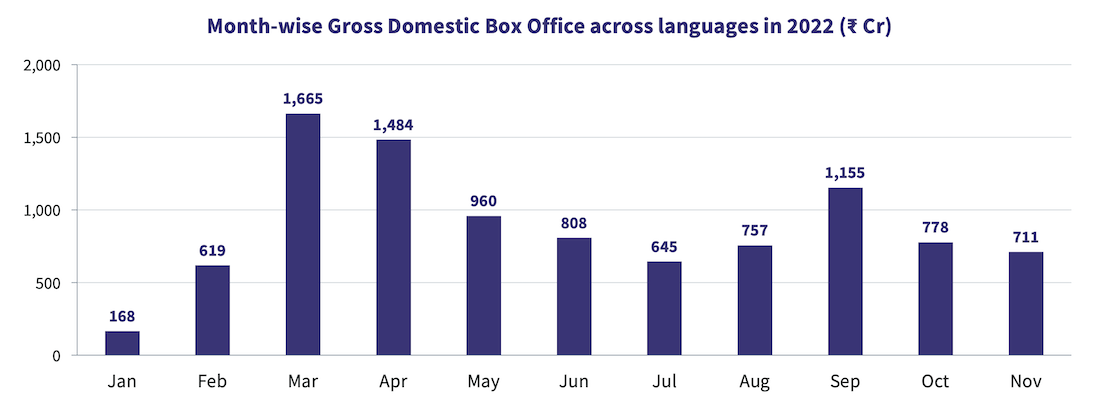 Language share fluctuates at a monthly level, depending on the big releases that month. Hence, we report language shares based on year-to-date numbers (Jan-Nov 2022 in this case). For this calculation, language-wise box office of films releasing in multiple languages is assigned to the corresponding language. However, for Hollywood, the data for all languages is reported under the language head ‘Hollywood’.