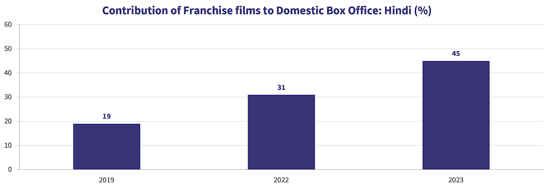 The chart above indicates that, as on Dec 3, 2023, 45% of Hindi theatrical domestic box office of the year has come from franchise films, or those belonging to a franchise universe, at the time of their release. This percentage was only 17% in 2019, and 31% in 2022, showing their growing significance.